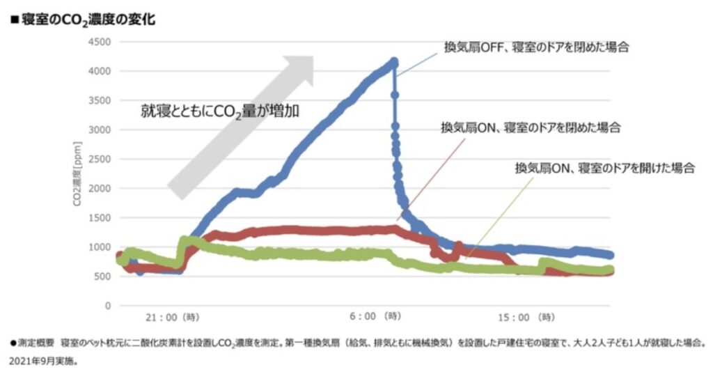 そのため、換気をしない寝室は、睡眠時どんどん二酸化炭素の量が増えています。