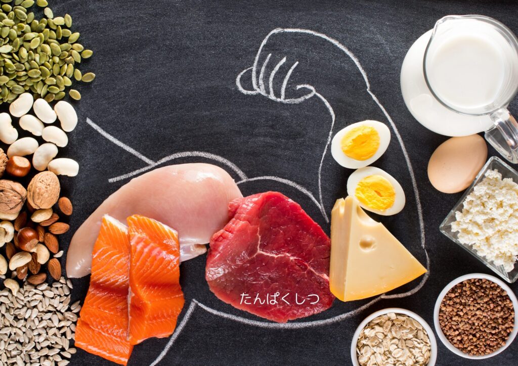 - タンパク質(肉、魚、卵、豆など)筋肉や体を作るために必要。