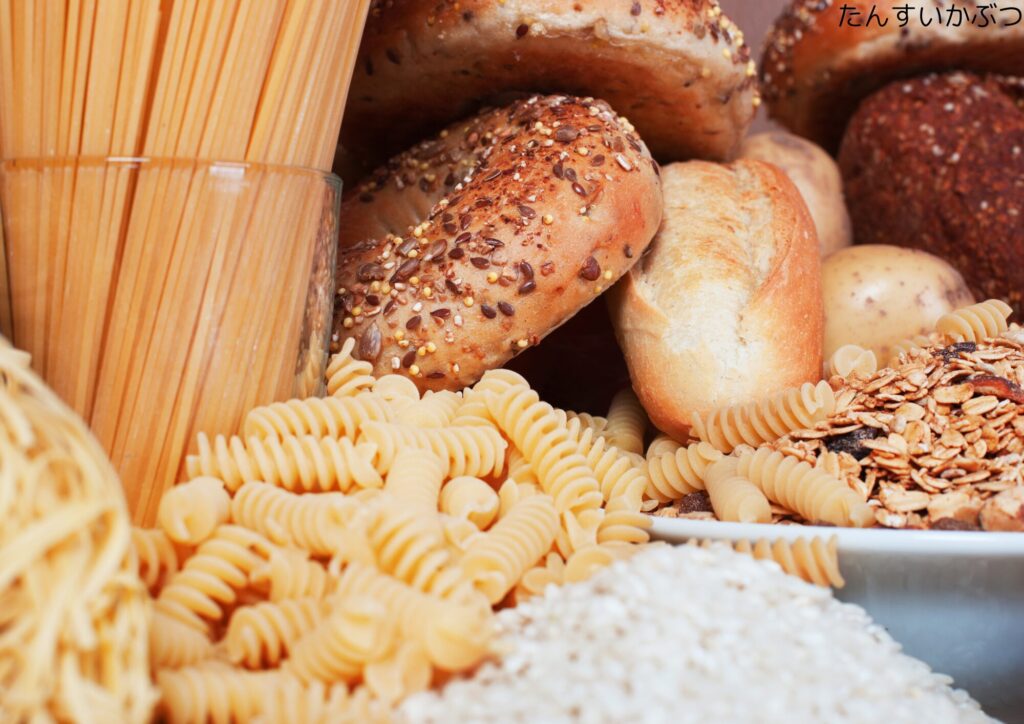 糖質は、砂糖、ご飯や麺類、パンや穀物、パスタ、芋類や豆や果物などで、ぶどう糖などに分解されて体の中でエネルギーのもとになります。
