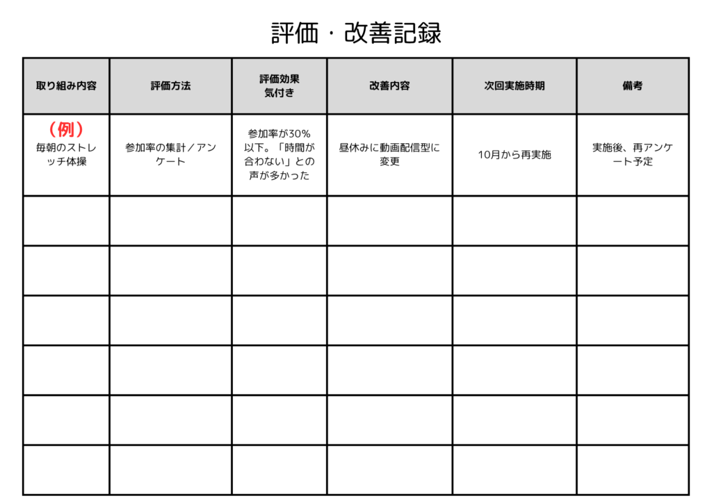 「ラジオ体操を導入した」「研修を行った」など、施策そのものは形になっていても、本当に効果があったのか?社員に変化はあったのか?という、その後の振り返りが抜けているケースも少なくありません。