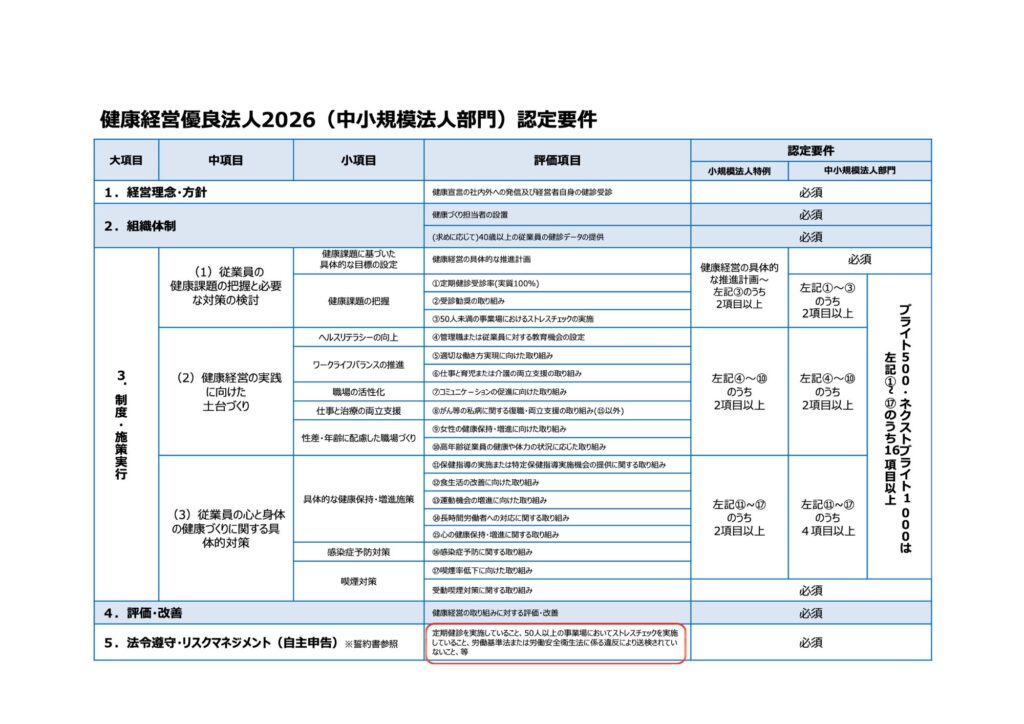 (参考:健康経営優良法人2026(中小規模法人部門)認定要件より)