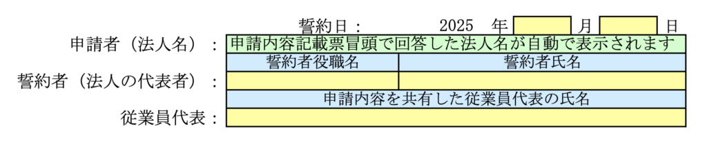 この誓約事項をしっかり読み、誓約のサインとして『誓約日・申請者(法人名)・誓約者(法人の代表者名)・従業員代表』を記入します。