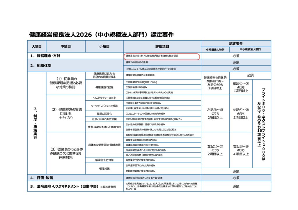 その認定要件のいちばん最初の必須項目1.経営理念・方針の部分に、【健康宣言の社内外への発信】と【経営者自身の健診受診】があります。(2026年度版)