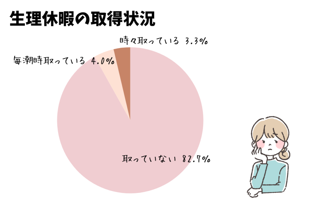 日本医労連女性協議会によると、生理休暇の取得状況は、「取っていない」(82.7%)が8割を超える一方、「毎潮時取っている」(4.0%)と「時々取っている」(3.3%)を合わせた割合は7.3%となり、取得している割合は1割にも満たなかったとのことです。そして、取得しない理由は「周りが誰も取っていない」がトップでした。