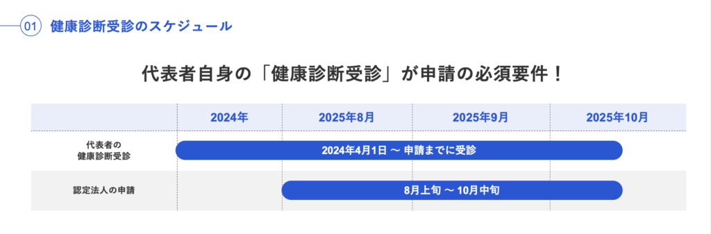 (例)2026年度の健康経営優良企業に認定されたい場合、2024年4月1日以降に健康診断(人間ドック等を含む)を受診している必要がある。この場合、申請期間が2025年8月〜10月なので、それまでに余裕を持って受診しよう。