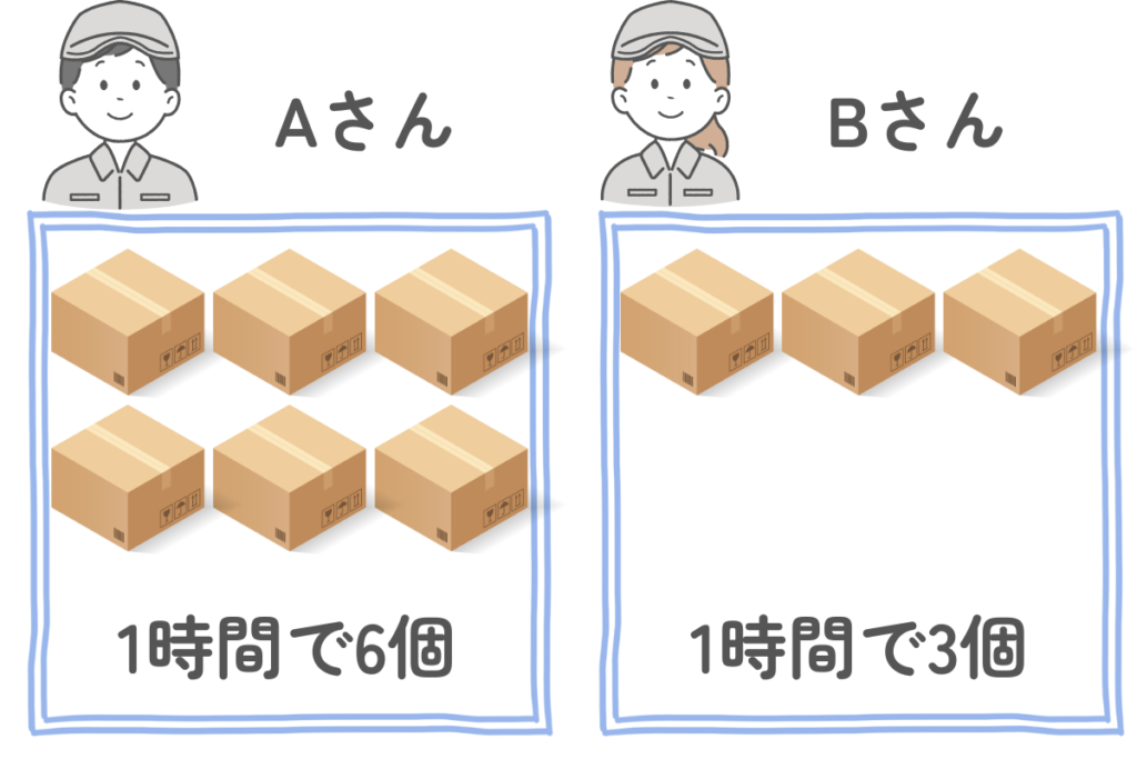 たとえば、ある工場で1時間に6個の製品を作れる場合と、1時間に3個しか作れない場合を比べると、前者の方が労働生産性が高いということになります。