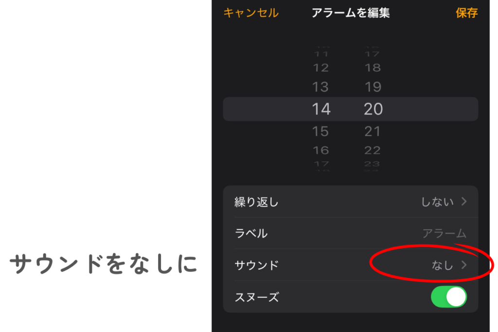 ▼iPhoneの場合、アラームの設定画面でサウンドをなしにするとバイブレーションでのアラーム設定ができます。