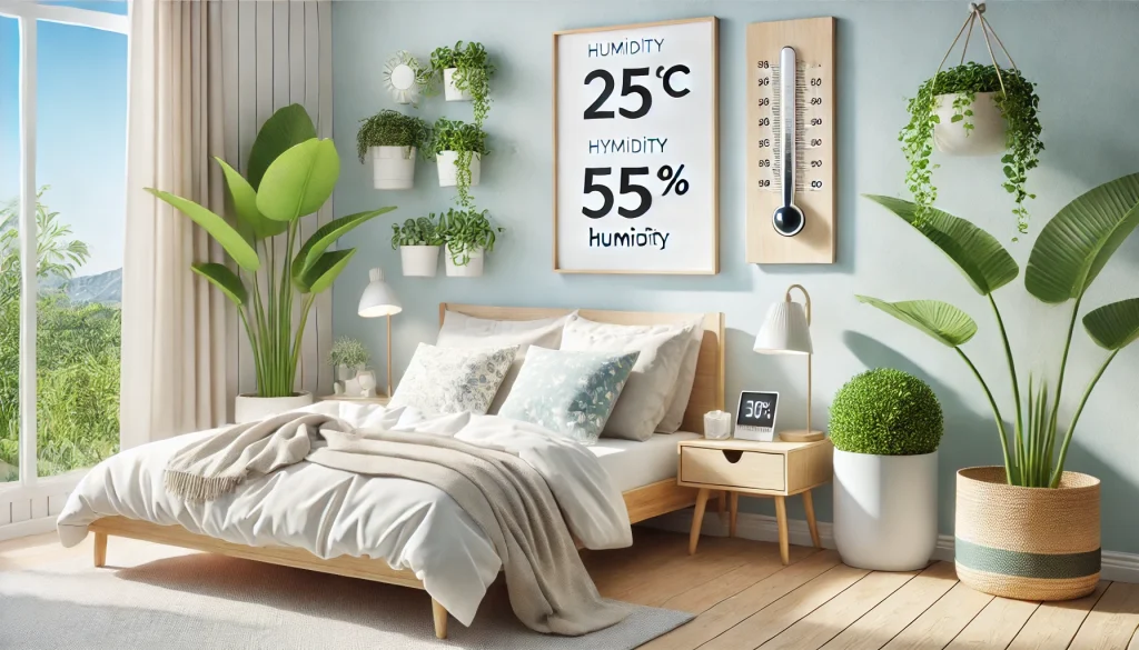 - 寝室の湿度を一定に保つためのアイデア(換気、湿度計の設置、観葉植物の活用)。