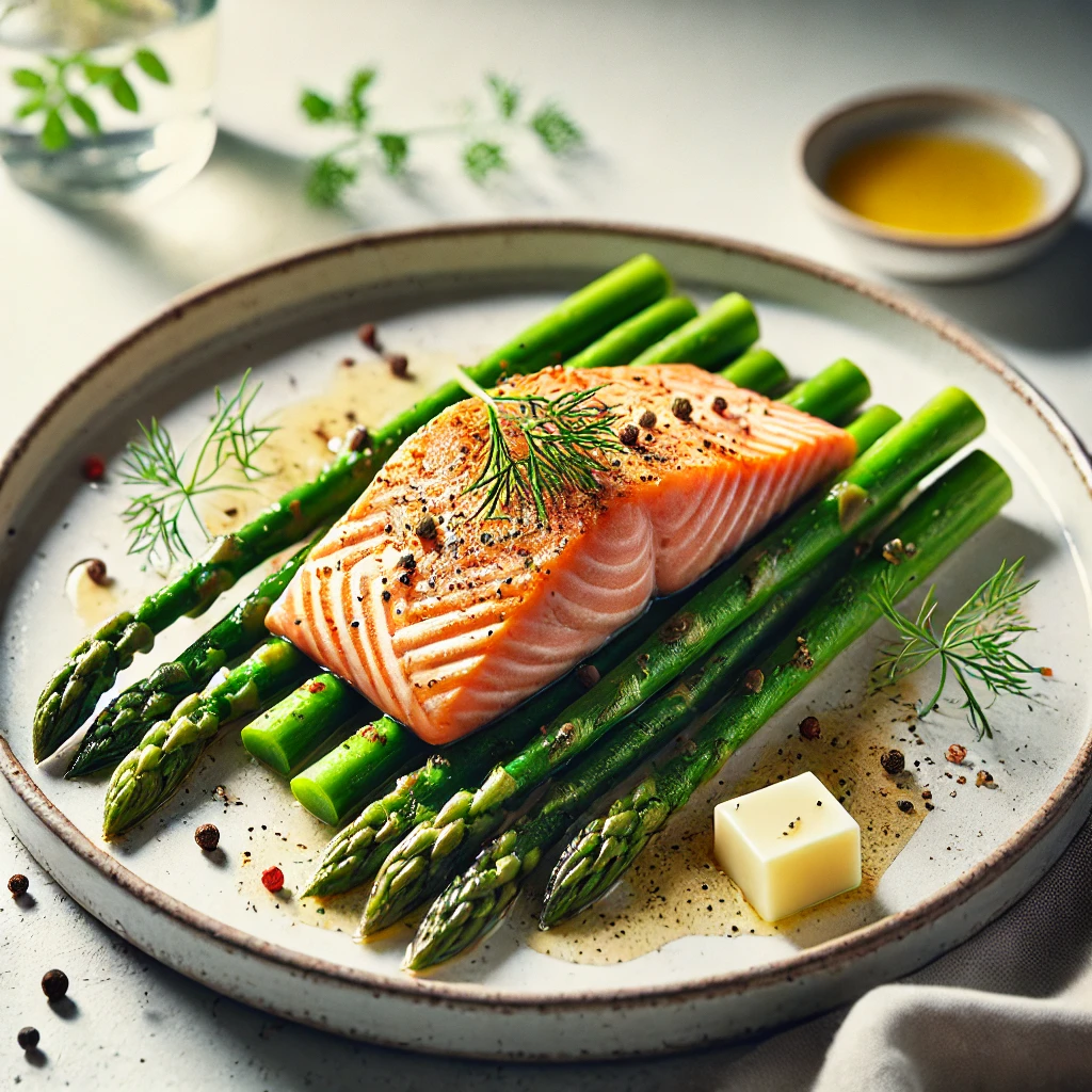 【材料】サーモン2切れ、アスパラガス4本、バター大さじ1、塩コショウ少々